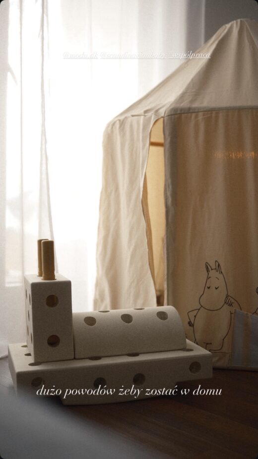 @ania.multana – 04.2026 – MODU Dreamer set – Kreatywne klocki rozwijające motorykę dużą, Sand Grey / Honey Yellow + Kid’s Concept – Namiot MOOMIN